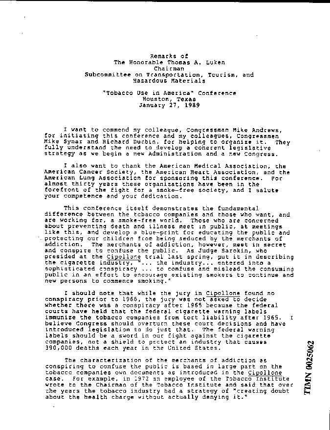 Tobacco Industry File Document: Remarks of Honorable Thomas A. Luken at "Tobacco Use in America" Conference