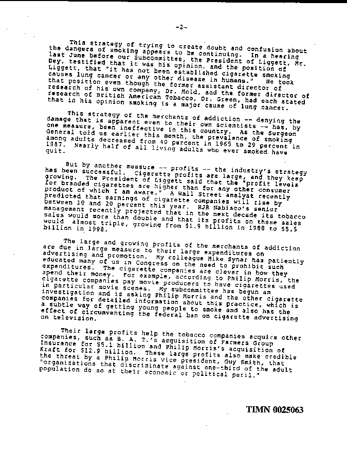 "This strategy of trying to create doubt and confusion about the dangers of smoking appears to be continuing. In a hearing last June before our subcommittee, the President of Liggett, Mr. Dey, testified that it was his opinion, and the position of Liggett, that 'it has not been established cigarette smoking causes lung cancer or any other disease in humans.' ...The President of Liggett said that the 'profits levels for branded cigarettes are higher than for any other consumer product of which I am aware.'"