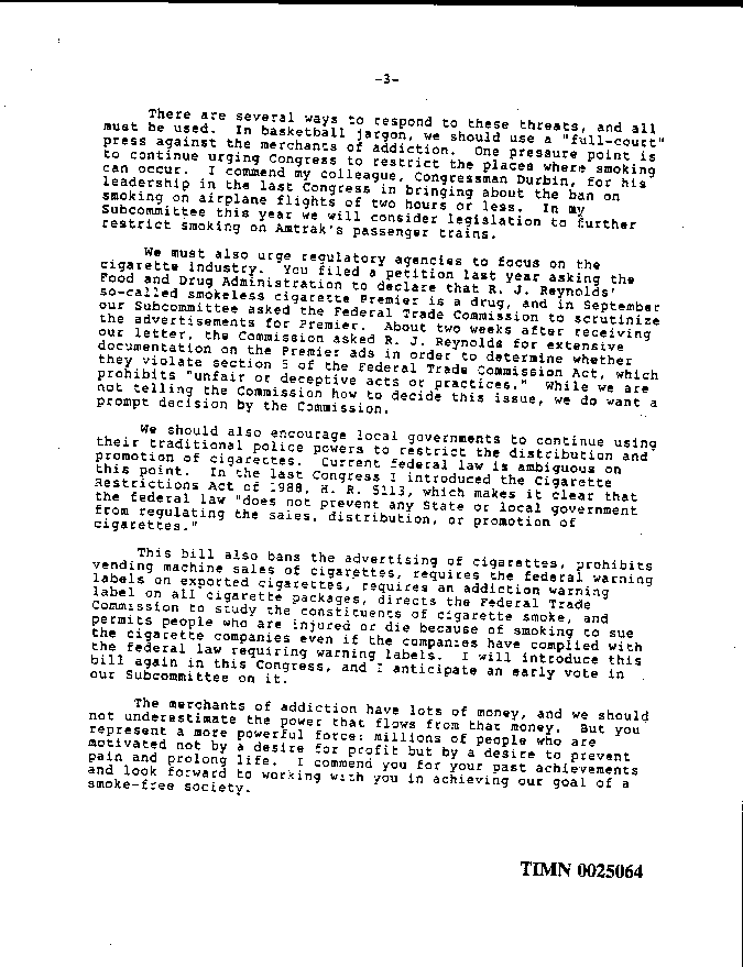 "There are several ways to respond to these threats, and all must be used. In basketball jargon, we should use a 'full-court' press against the merchants of addiction. One pressure point is to continue urging Congress to restrict the places where smoking can occur."