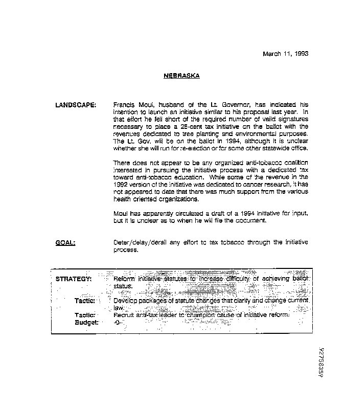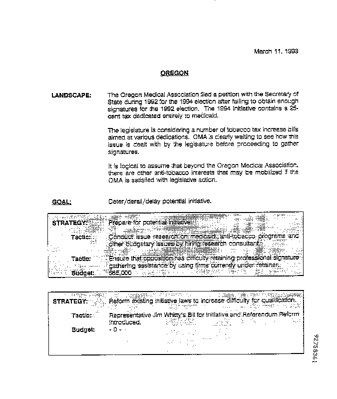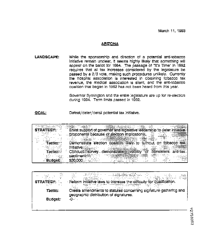 BACKGROUND NOTE: This document summarizes the legislative landscape in Arizona, California, Colorado, Michigan, Nebraska and Oregon in 1993, and explains the "problems" the Tobacco Industry (TI) is dealing with in those states. It gives the strategies for fighting tax initiatives and other popular and political anti-tobacco efforts in these states, and offers the budgets for fighting them as well.