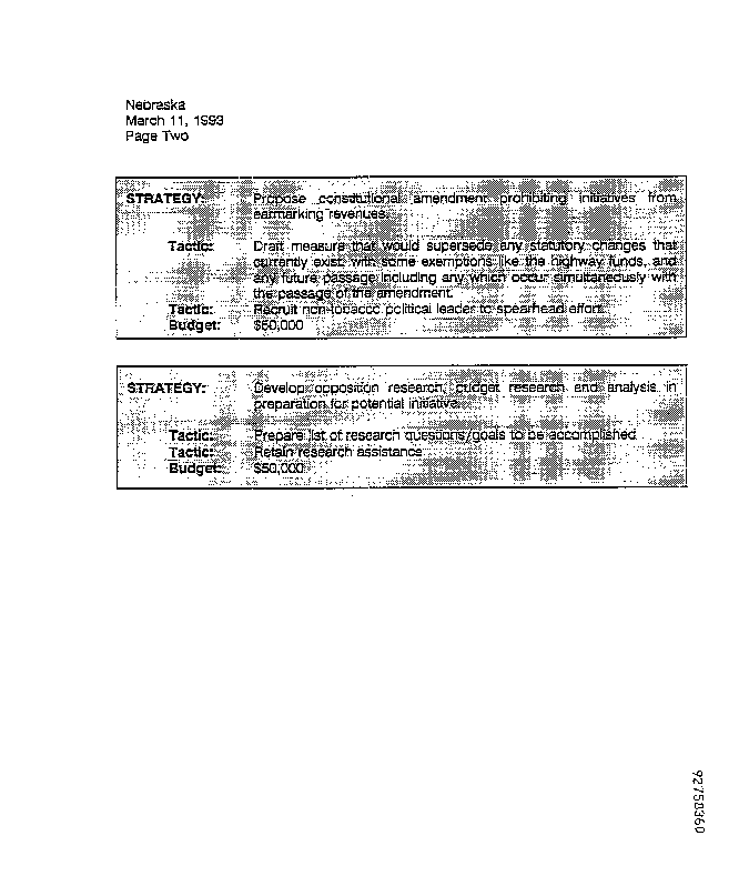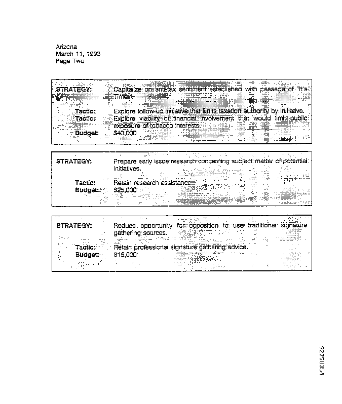 "Strategy: Reduce opportunity of initiative proponents to retain the services of professional signature-gathering firms. Tactic: use a variety of firms for other tobacco purposes. Budget $15,000"