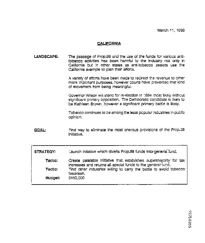 Realizing that Prop. 99 was a reality in California, TI adopted the bailout strategy we now see them using, stating clearly in this document that their tactic was to "Launch initiative which diverts Prop 99 funds into General Fund."