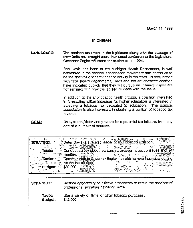 "Strategy: Deter [Ron] Davis, a strategic leader of anti-tobacco coalition. Tactic: Conduct survey about relationship between tobacco issues and '94 election. Tactic: Communicate to Gov. Engler the risks he runs from abandoning his no-tax pledge. Budget: $30,000."