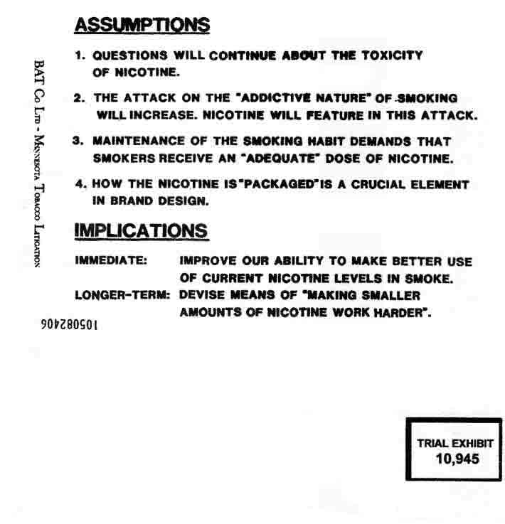 ASSUMPTIONS: 1. Questions will continue about the toxicity of nicotine. 2. The attack on the "addictive nature" of smoking will increase. Nicotine will feature in this attack. 3. Maintenance of the smoking habit demands that smokers receive an "adequate" dose on nicotine. 4. How nicotine is "packaged" is a crucial element in brand design. IMPLICATIONS...