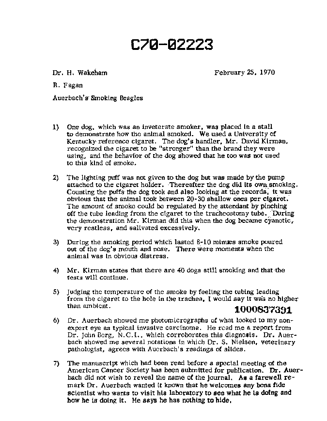 Before you use this document as an example of TI [tobacco industry] mistreatment of animals, you should know that the animals in question were the famous smoking beagles in Dr. Oscar Auerbach's lab in New Jersey, not animals mistreated in a TI lab.