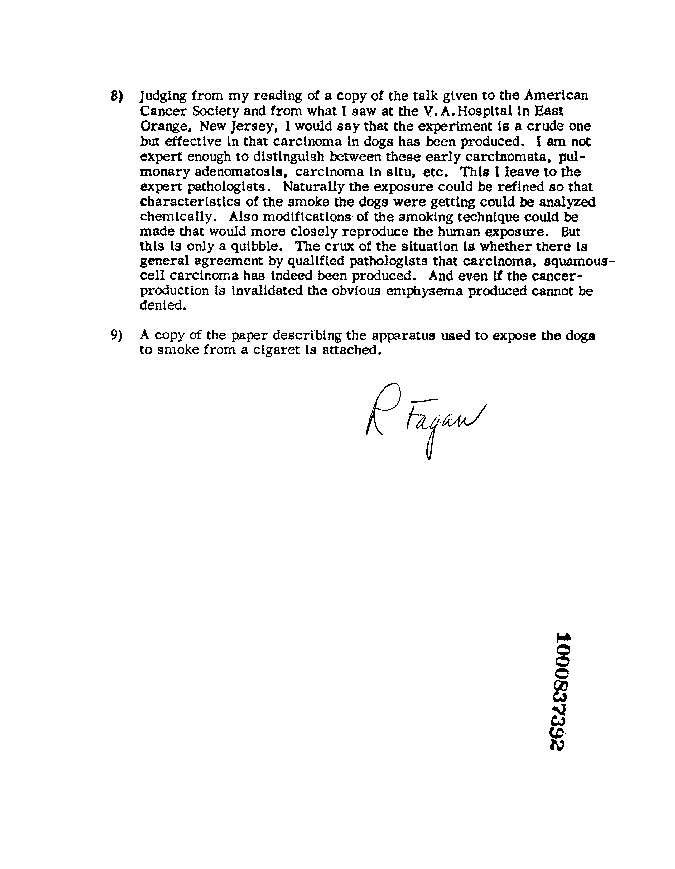 ...I would say that the experiment is a crude one but effective in that carcinoma in dogs has been produced....Modifications of the smoking technique could be made that would more closely reproduce the human exposure. But this is only a quibble. The crux of the situation is whether there is general agreement by qualified pathologists that carcinoma, squamous-cell carcinoma has indeed been produced. And even if the cancer-production is invalidated, the obvious emphysema produced cannot be denied.