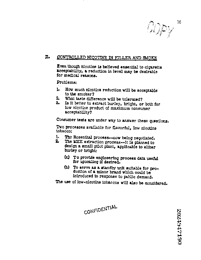 Nicotine believed essential to cigarette acceptability, but reduction may be desirable for medical reasons.