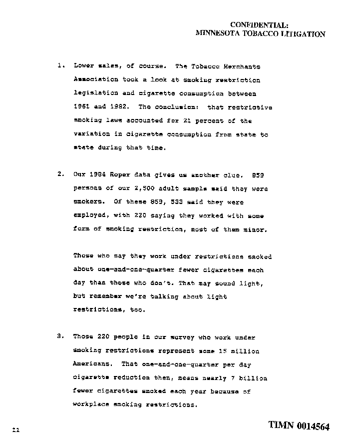 [again citing Roper data]...Those who say they work under [smoking] restrictions smoked about one-and-a-quarter fewer cigarettes each day than those who don't. That may sound light, but remember we're talking about light restrictions, too.... Those 220 people in our survey who work under smoking restrictions represent some 15 million Americans. That one-and-one-quarter per day cigarette reduction, then, means nearly 7 billion fewer cigarettes smoked each year because of workplace smoking restrictions... That's 350 million packs of cigarettes. At a dollar a pack, even the lightest of workplace smoking restrictions is costing this industry 233 million dollars a year in revenue. How much more will it cost us with far more restrictive laws such as those in Suffolk County and Fort Collings now being enacted?