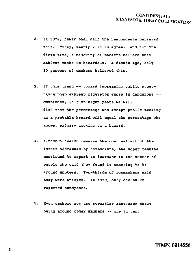 Our ninth Roper survey last year showed a dramatic increase in the number of respondents who believe it is probably hazardous to be around people who are smoking. In 1974, fewer than half of the respondents believed this. Today, nearly 7 in 10 agree. And for the first time, a majority of smokers believe that ambient smoke is hazardous. A decade ago, only 30 percent believed that. If this trend -- toward increasing public acceptance that ambient cigarette smoke is dangerous -- continues, in just eight years we will find that the percentage who accept public smoking as a probable hazard will equal the percentage who accept primary smoking as a hazard.