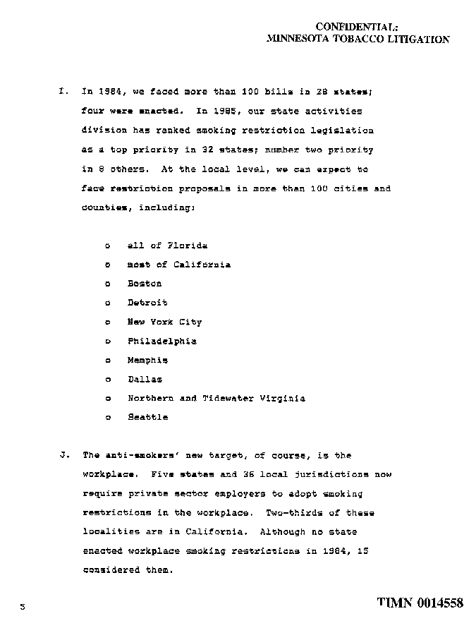 It also discusses the industry's lobbying structure in the states, the difficulties the industry faces due to the efforts of voluntary health organzations, and reveals the results of the tobacco industry's own polls that show overwhelming (and steadily increasing) public support for smoke-free public places and workplaces: