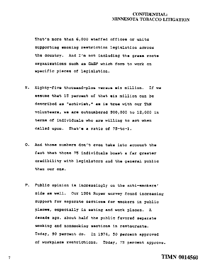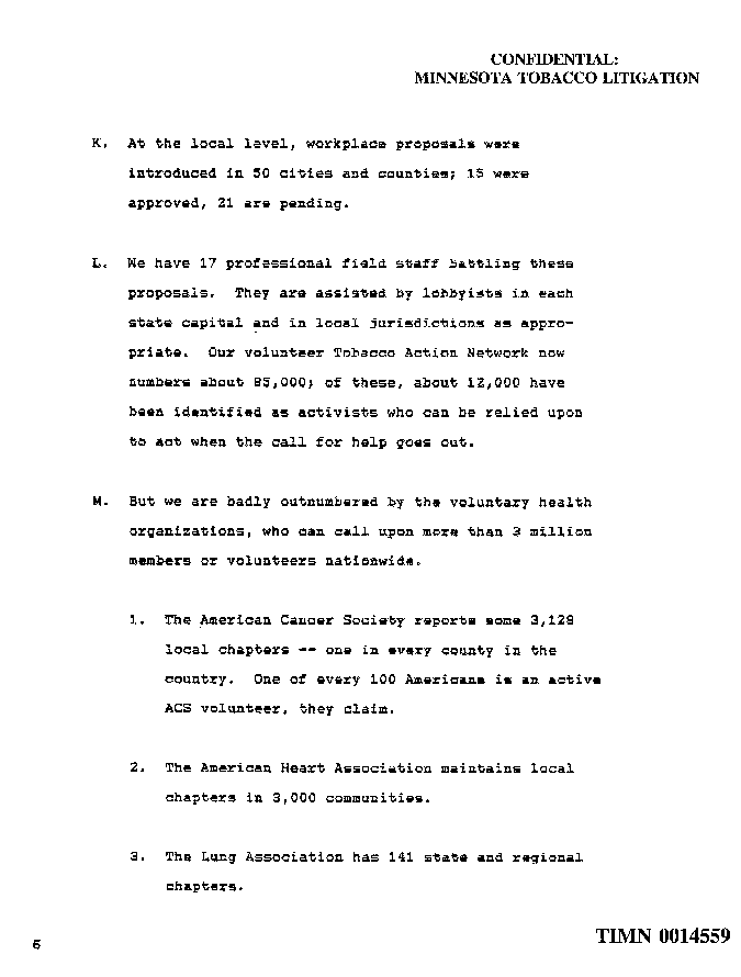 We have 17 professional field staff battling these proposals. They are assisted by lobbyists in each state capital and in local jurisdictions as appropriate. Our volunteer Tobacco Action Network now numbers 85,000; of these, about 12,000 have been identified as activists who can be relied upon to act when the call for help goes out. Yet, we are badly outnumbered by the voluntary health organizations who can call upon more than 3 million members or volunteers nationwide.
