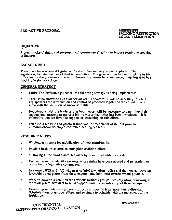 Objective: "Protect smokers' rights and preempt local governments' ability to impose restrictive smoking ordinances." "...There have been been repeated legislative efforts to ban smoking in public places. The legislation, to date, has been killed in committee. The governor has banned smoking in his office and in the governor's mansion." Our general strategy is...
