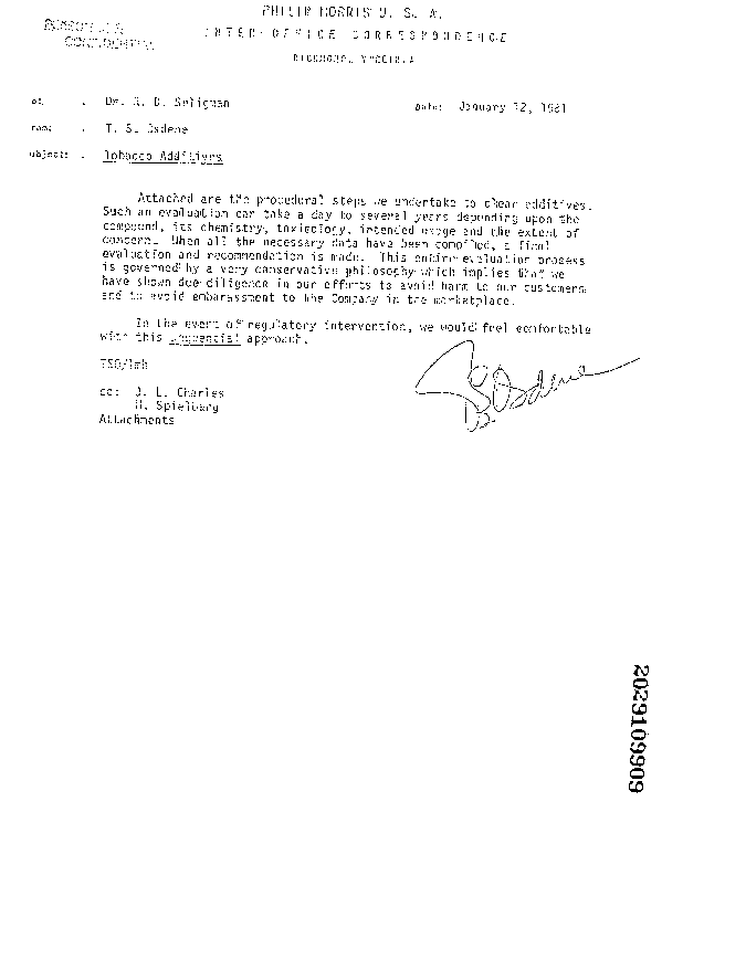 "Attached are the procedural steps we undertake to clear additives. Such an evaluation can take a day to several years... The entire evaluation process is governed by a very conservative philosophy which implies that we have shown due diligence in our efforts to avoid harm to our customers and to avoid embarassment to the Company in the marketplace." "In the event of regulatory intervention, we would feel comfortable with this [unreadable word] approach."