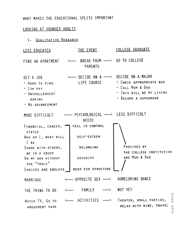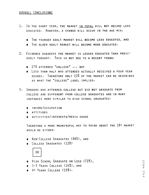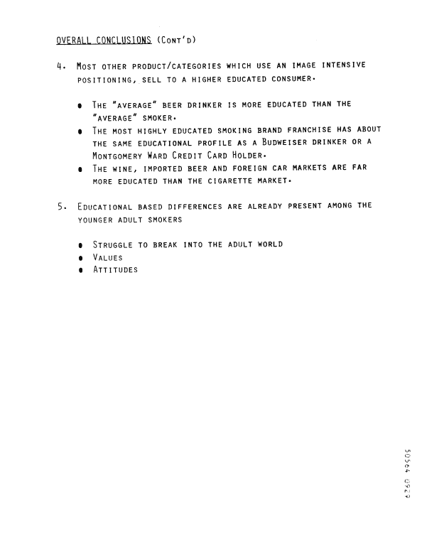 "Most other product/categories which use an image intensive position, sell to a higher educated consumer..." "The 'average' beer drinker is more educated than the 'average' smoker." "The most highly educated smoking brand franchise has about the same educational profile as a Budwiser drinker or a Montgomery Ward Credit Card Holder."