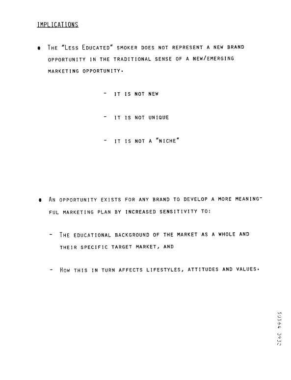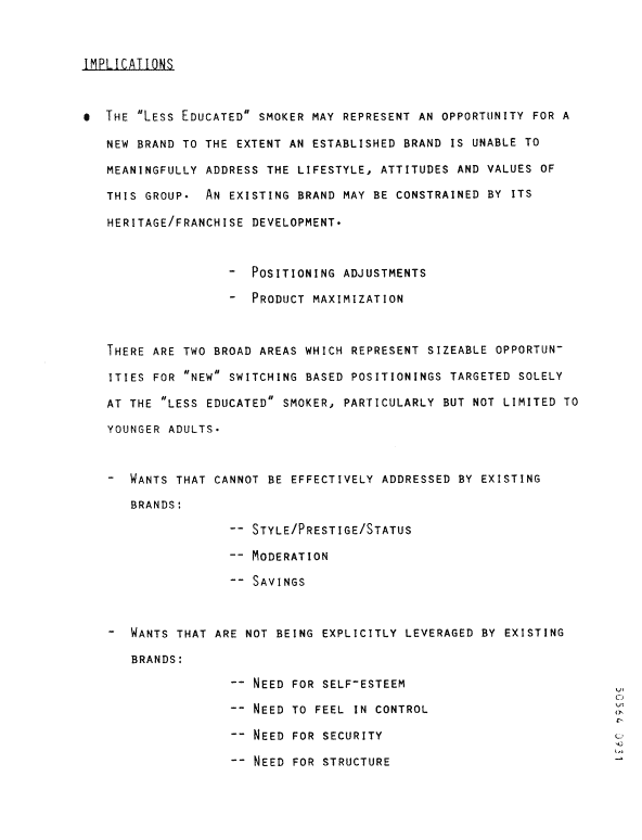 "There are two broad areas which represent sizeable opportunities for "new" switching based positionings targeted solely at the 'less educated' smoker, particularly but not limited to younger adults."