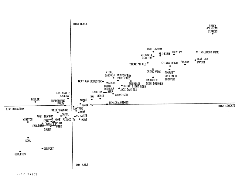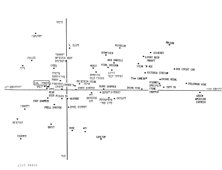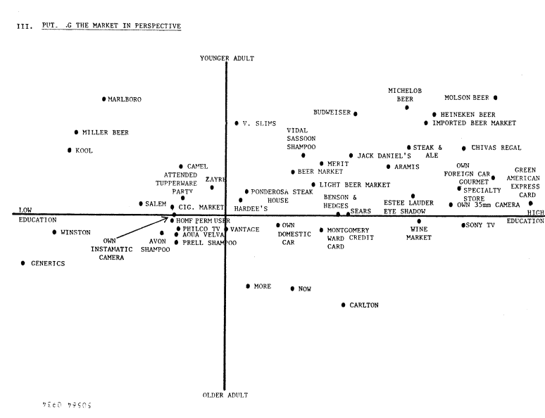 Chart illustrates a four-space typology that compares low-to-high education with younger-to-older adults. The youngest "adults" who are "lesser educated" smoke Marlboro cigarettes. Those with the "lowest education" smoke generic cigarettes, Winstons or Kools. [click on image to enlarge to full size -- 18K]