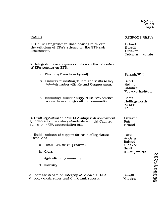 TASKS: "1. Utilize Congressman Rose hearing to elevate the criticism of EPA's science on the ETS risk assessment. 2. Integrate tobacco growers into objective of review of EPA science on ETS." "...5. Increase debate on integrity of science at EPA through conferences and think tank reports."
