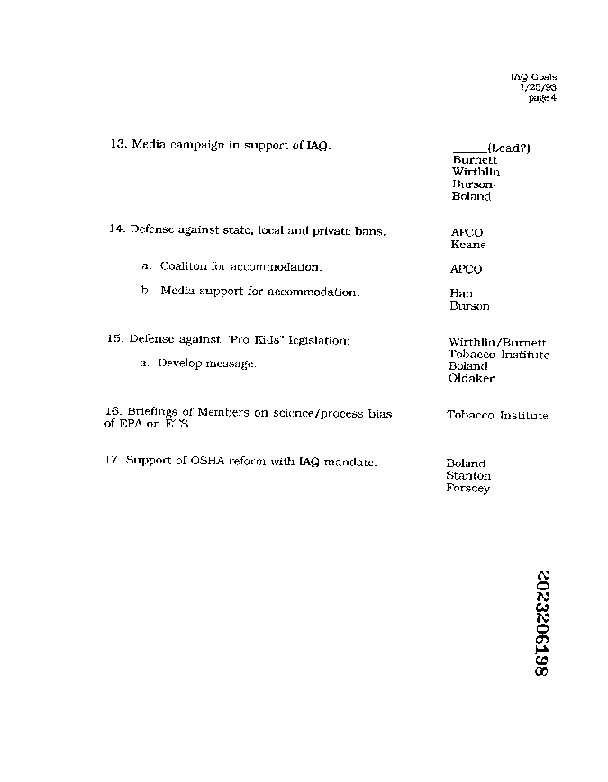 "13. Media campaign in support of IAQ. 14. Defense against state, local and private bans... 15. Defense against 'Pro Kids' legislation. 16. Briefing of Members on science/process bias of EPA on ETS."