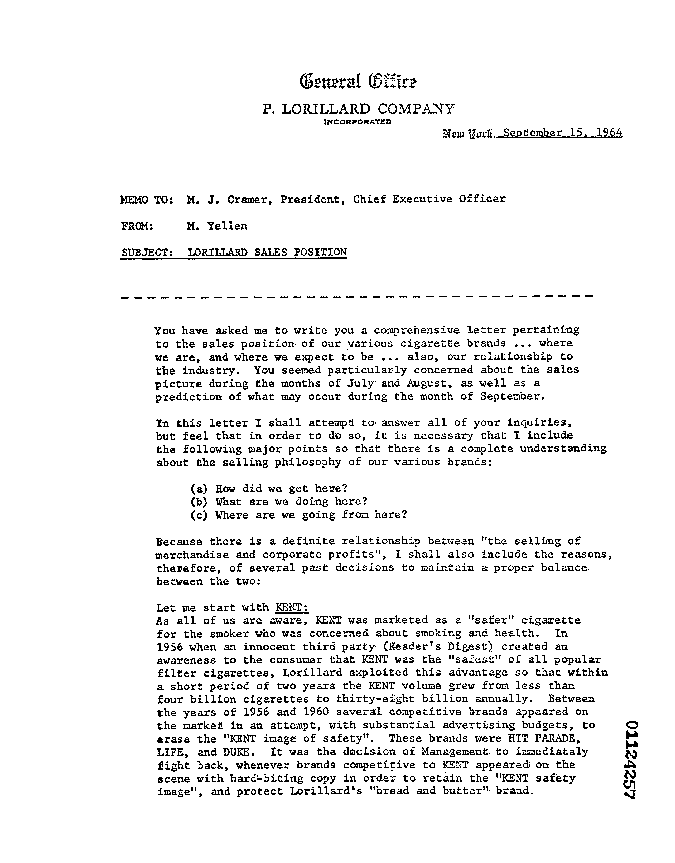 "As all of us are aware, KENT was marketed as a 'safer' cigarette for the smoker who was concerned about smoking and health. In 1956 when an innocent third party (Reader's Digest) created an awareness to the consumer that KENT was the 'safest' of all popular filter cigarettes, Lorillard exploited this advantage so that within a short period of two years the KENT volume grew from less than four billion cigarettes to thirty-eight billion annually."