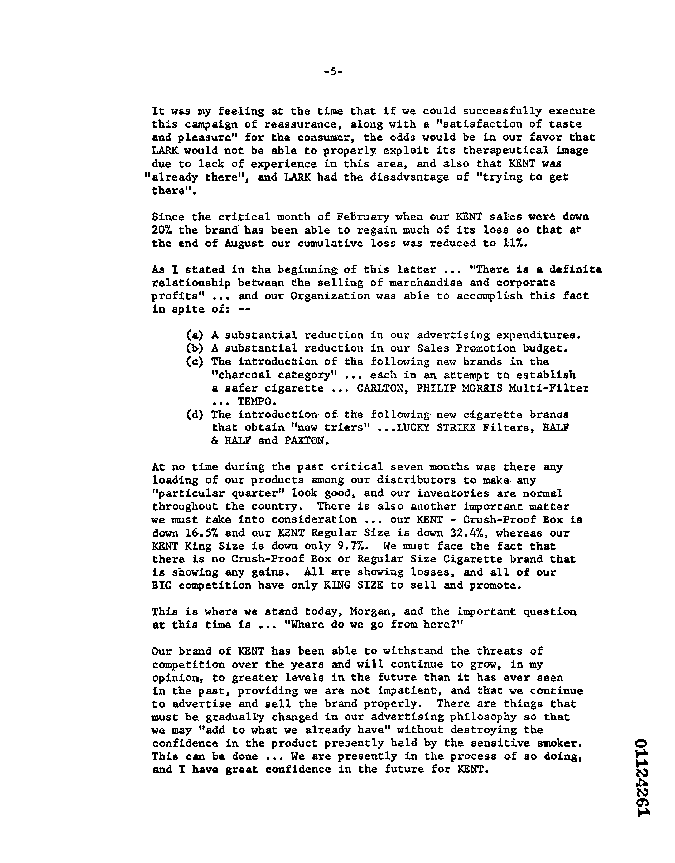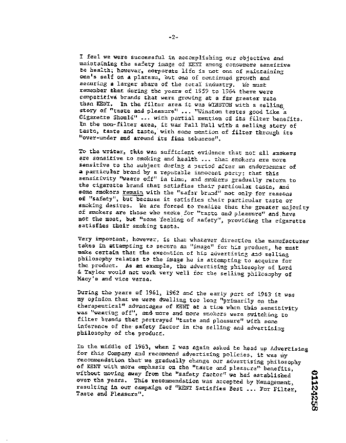 "Between the years of 1956 and 1960 several competetive brands appeared on the market in an attempt, with substantial advertising budgets, to erase the 'KENT image of safety.' These brands were HIT PARADE, LIFE and DUKE. It was the decision of management to immediately fight back, whenever brands competetive to KENT appeared on the scene with hard-biting copy in order to retain the 'KENT safety image,' and protect Lorillard's 'bread and butter' brand."