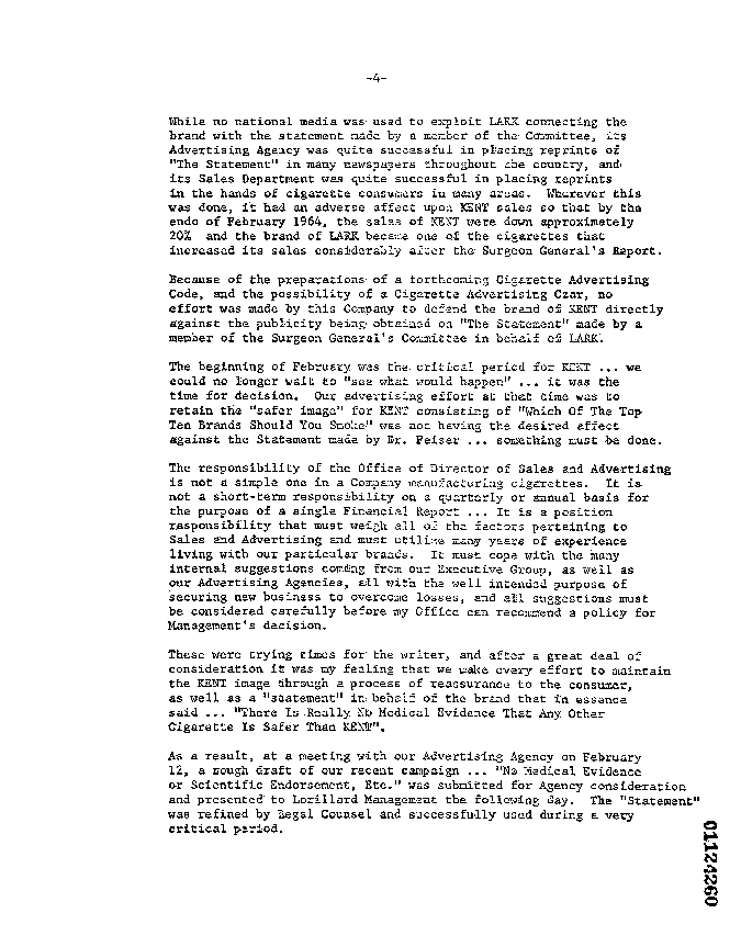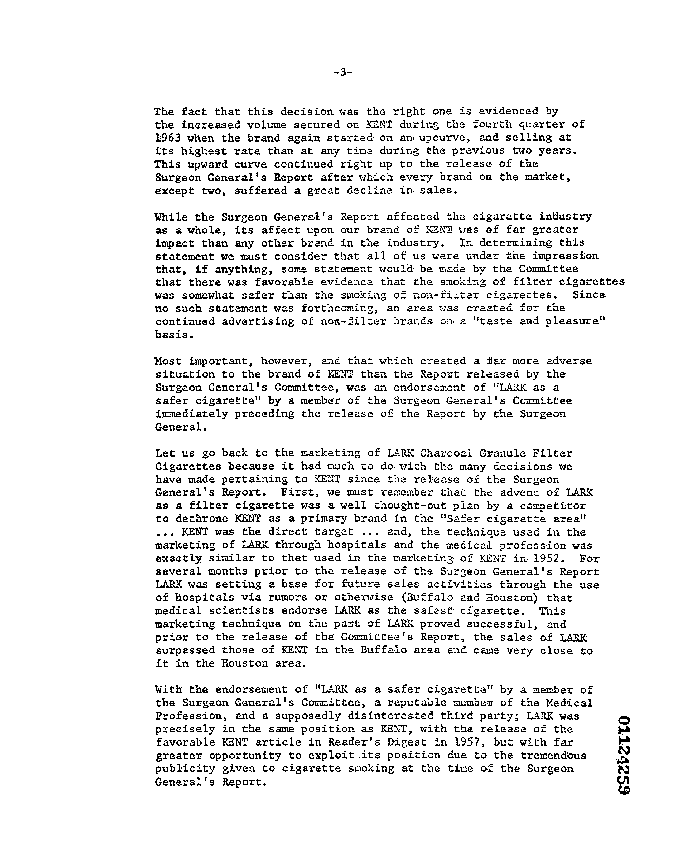 "...the technique used in the marketing of LARK through hospitals and the medical profession was exactly similar to that used in the marketing of KENT in 1952. For several months prior to the release of the Surgeon General's report LARK was setting a base for future sales activities through the use of hospitals via rumors or otherwise (Buffalo and Houston) that medical scientists endorse LARK as the safest cigarette. This marketing technique on the part of LARK proved successful, and the sales of LARK surpassed those of KENT in the Buffalo area and came very close to it in the Houston area."
