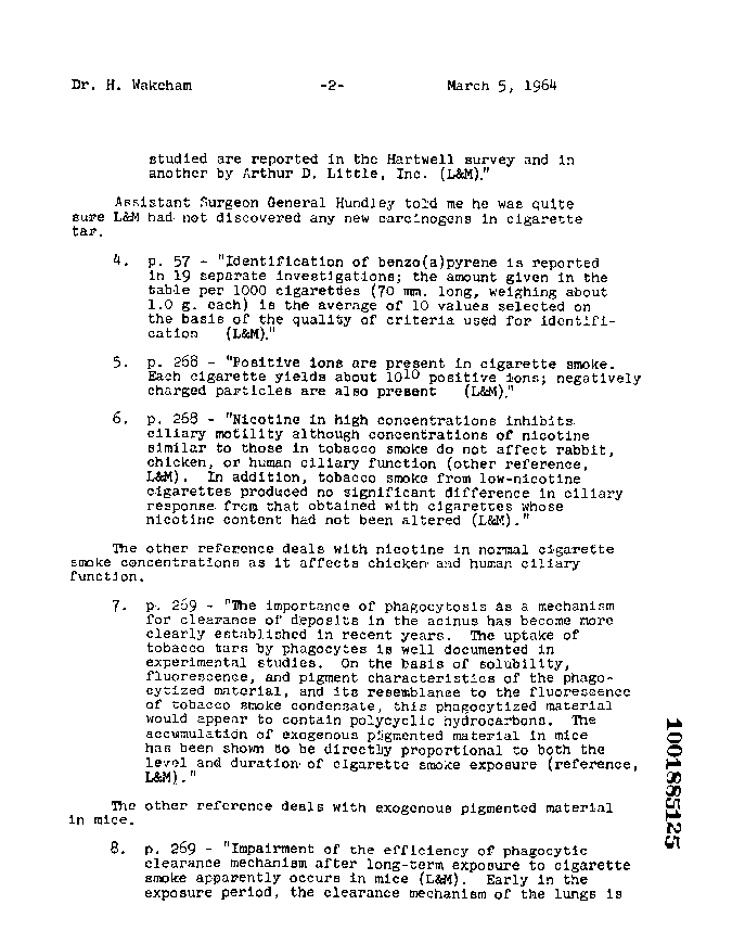 "Assistant Surgeon General Hundley told me he was quite sure L&M had not discovered any new carcinogens in cigarette tar." "...Identification of benzo(a)pyrene is reported in 19 separate investigations;" "...Positive ions are present in cigarette smoke." "...Nicotine in high concentrations inhibits ciliary motility although concentrations of nicotine similar to those in tobacco smoke do not affect rabbit, chicken, or human ciliary functions..."