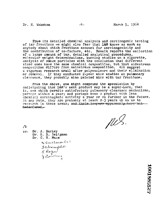 "From its detailed chemical analysis and carcinogenic testing of tar fractions we might also fear that L&M knows as much as anybody about which fractions account for carcinogenicity and the contribution of co-factors, etc." "...From the above, one might compound the speculation by anticipating that L&M's next product may be a super-Lark, that is, one which permits satisfactory pulmonary clearance mechanisms, perhaps within a year;"