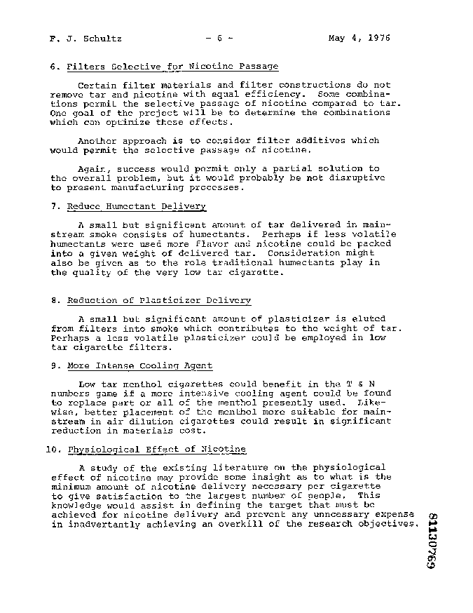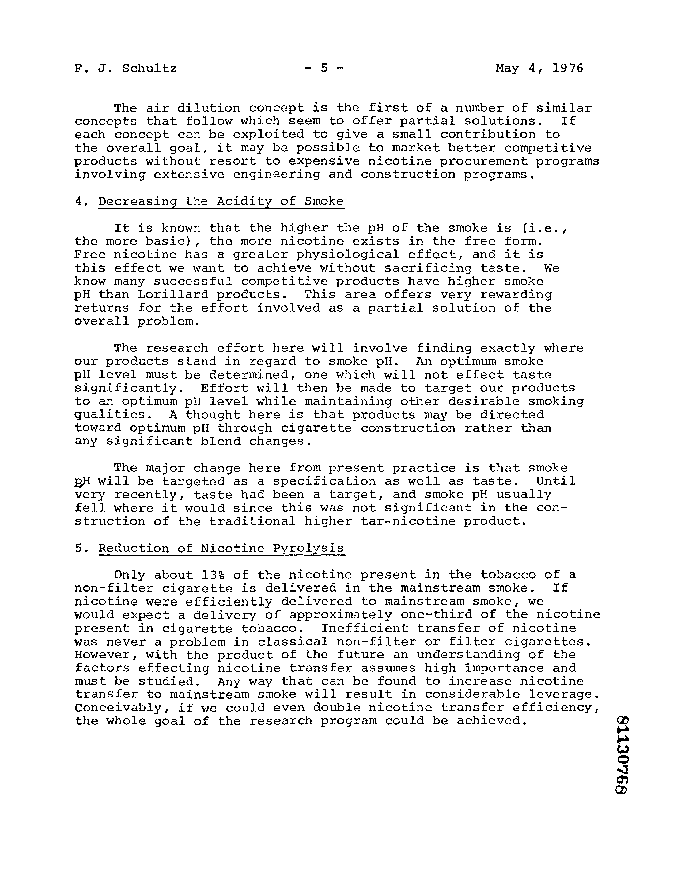 It has been reported in the literature, and verified by experiments here that air dilution of cigarette smoke results in up to 40% higher nicotine delivery than might be expected by conventional construction. The reason for the effect is not understood. This could well be a very rewarding and inexpensive partial solution to the whole problem. Surely, new concepts of filter construction involving air dilution should be vigorously pursued to heighten and maximize the effect.