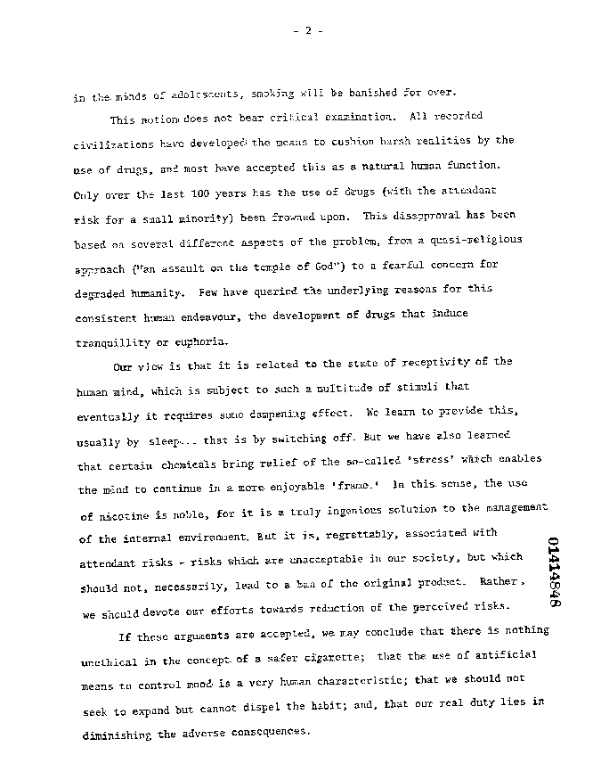 Our view is that is it related to the state of receptivity of the human mind, which is subject to a multitude of stimuli that evenually it requires some dampening effect....We have also learned that certain chemicals bring relief of the so-called 'stress' which enables the mind to continue in a more enjoyable 'frame'. In this sense, the use of nicotine is noble, for it is a truly ingenious solution to the management of the internal environment....