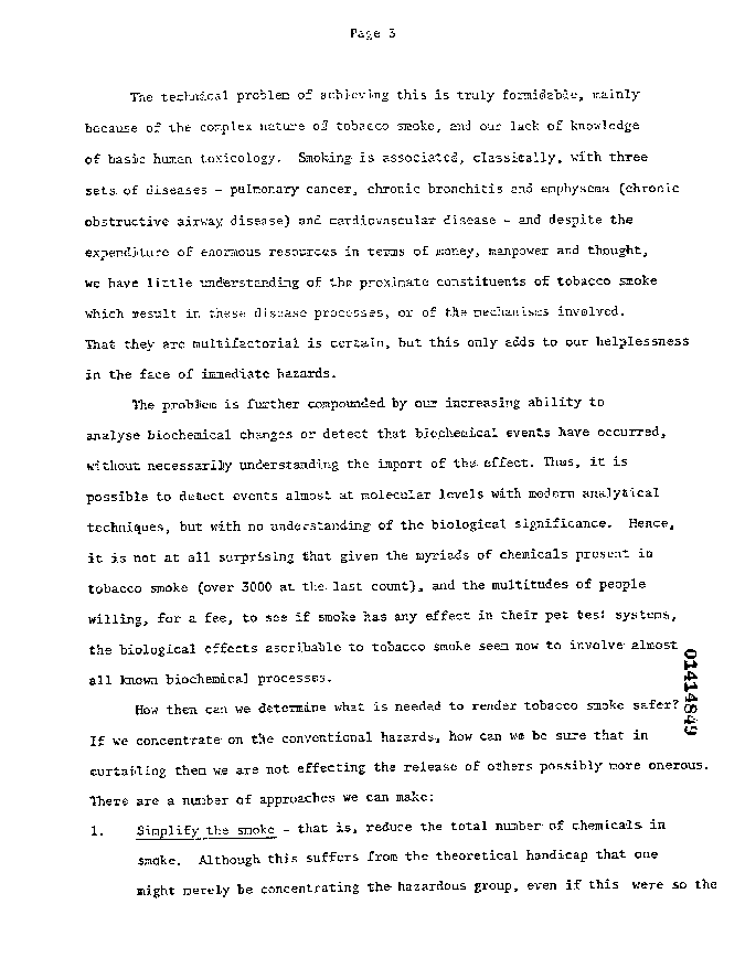 "The technical problem of achieving this is truly formidable, mainly because of the complex nature of tobacco smoke, and our lack of knowledge of basic human toxicology. Smoking is associated, classically, with three sets of diseases - pulmonary cancer, chronic bronchitis and emphysema (chronic obstructive airway disease) and cardiovascular disease," "...we have little understanding of the proximate constituents of tobacco smoke which result in these disease processes, or of the mechanisms involved."