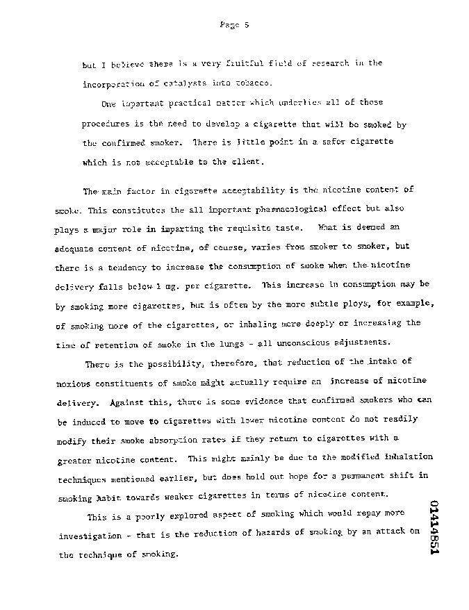 "The main factor in cigarette acceptability is the nicotine content of smoke."