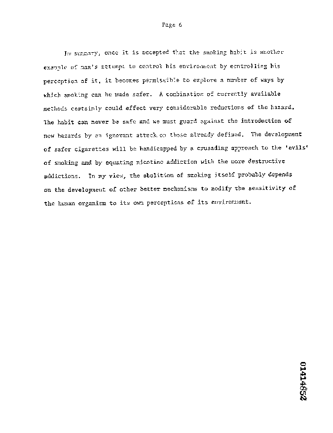 "In summary, once it is established that the smoking habit is another example of man's attempt to control his environment by controlling his perception of it, it becomes permissible to explore a number of ways by which smoking can be made safer."