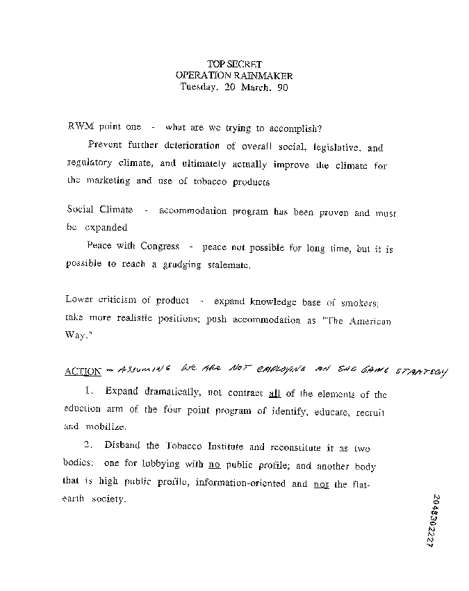 BACKGROUND NOTE: This Philip Morris document, Top Secret Operation Rainmaker, is already considered a classic by some "document moles" and probably by the few reporters who have written about it. I wanted to make sure everyone knew about this document, which proposes directions the industry should consider taking to try and reverse the decline of the social acceptability of smoking: