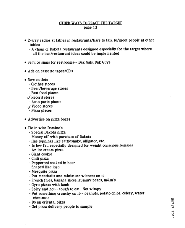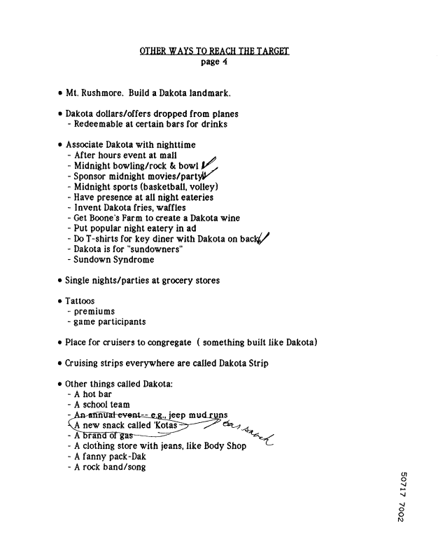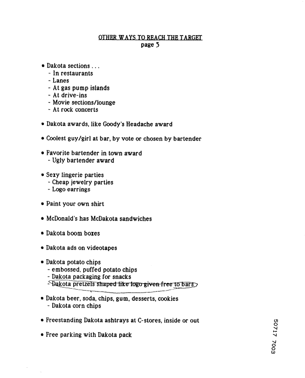 BACKGROUND NOTE: RJR introduced the Dakota brand as a competitor to Marlboro to compete for market share among younger smokers. This brainstorming document lists possible ways to market Dakota to this younger audience. We don't know which, if any, of these ideas may actually have been used, but the list itself is obviously the product of cigarette-marketing minds running absolutely free, and it offers valuable insight.