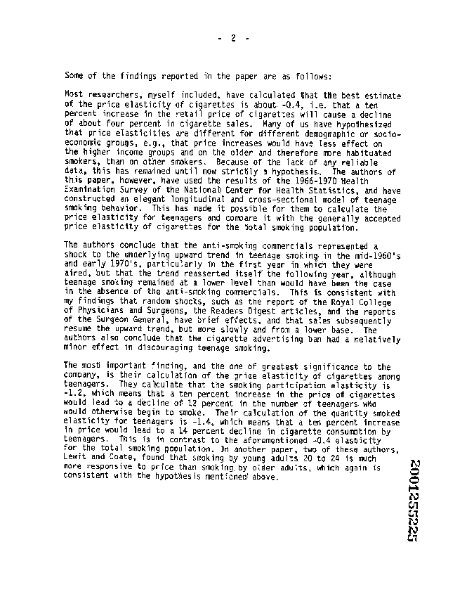 "The most important finding, and the one of greatest significance to the company, is their calculation of the price elasticity of cigarettes among teenagers... a 10% increase in the price of cigarettes would lead to a decline of 12% in the number of teenagers who would otherwise begin to smoke."