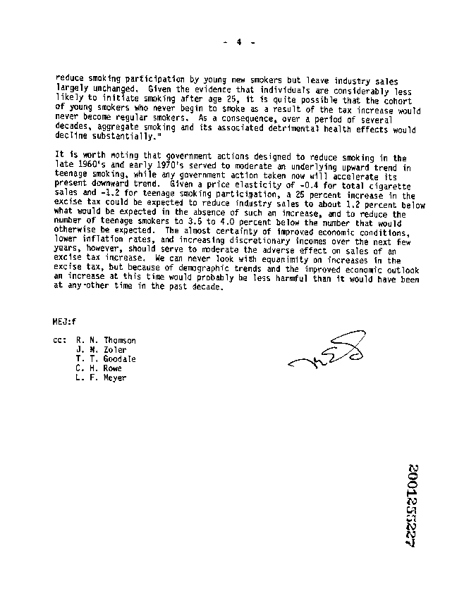 Philip Morris Inter-Office Correspondence: Teenage Smoking and the Federal Excise Tax on Cigarettes