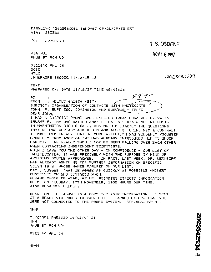 I had a surprise phone call earlier today from Dr. Bieva in Brussels. He was rather amazed that a certain Dr. Weimberg in Washington should call, asking him exactly the questions that we had already asked him and also offering him a contract. It made him uneasy that so much attention was suddenly focussed upon him from America (we had already introduced him to Shook Hardy). We really should not be seen falling over each other when contacting independent scientists.