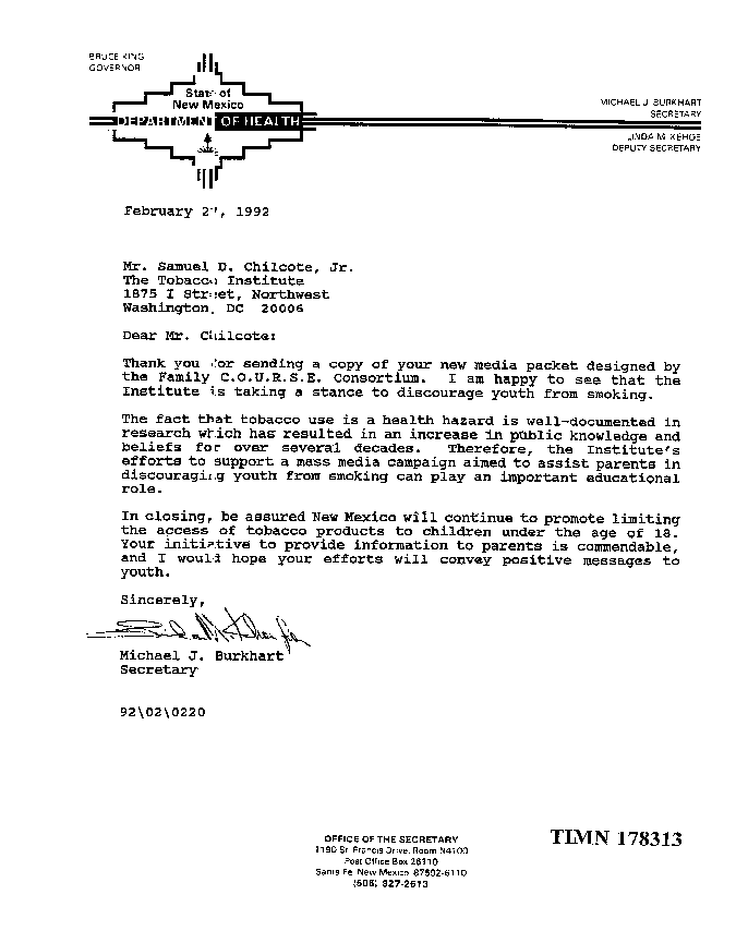 New Mexico DOH Secretary Commends Tobacco Institute Efforts to Provide Parents Information on Youth Smoking