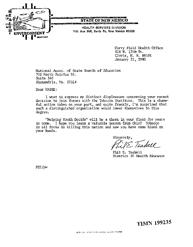 NM Health Services Letter to National Association of State Boards of Education (NASBE) Expressing Displeasure with Decision to Join Forces with Tobacco Institute