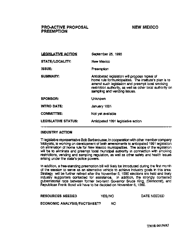 Tobacco Institute Document Listing Plans to Amend "Home Rule for Municipalities" and Preempt Local Smoking Restriction Authority