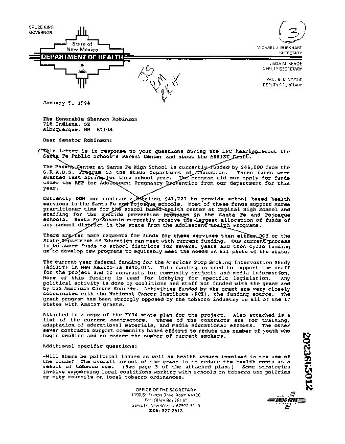 Philip Morris File on New Mexico Department of Health Letter to Senator Shannon Robinson