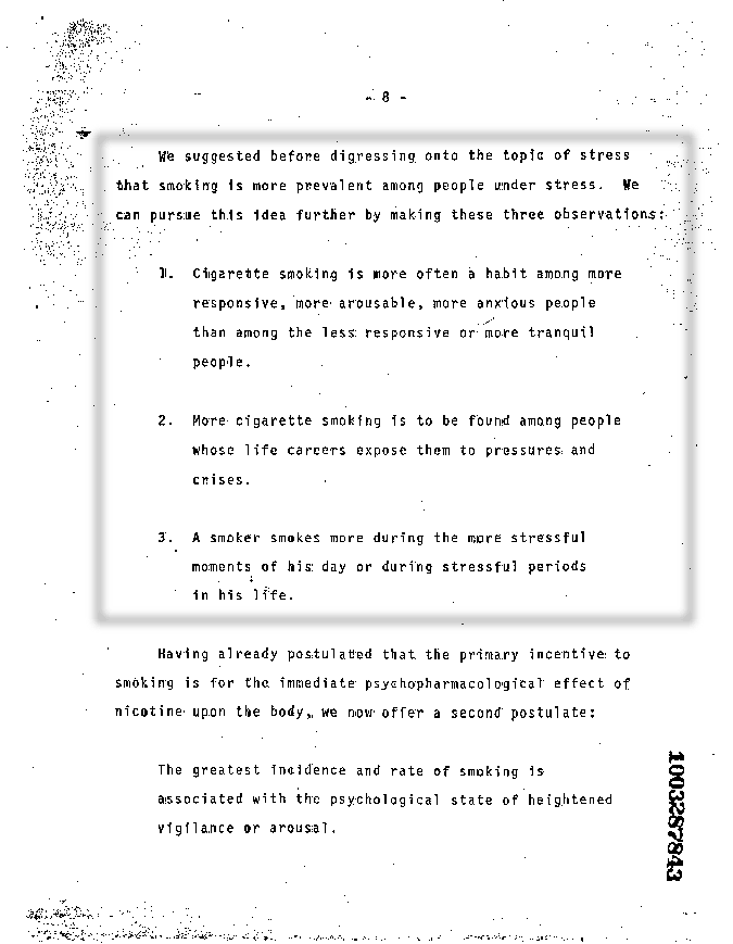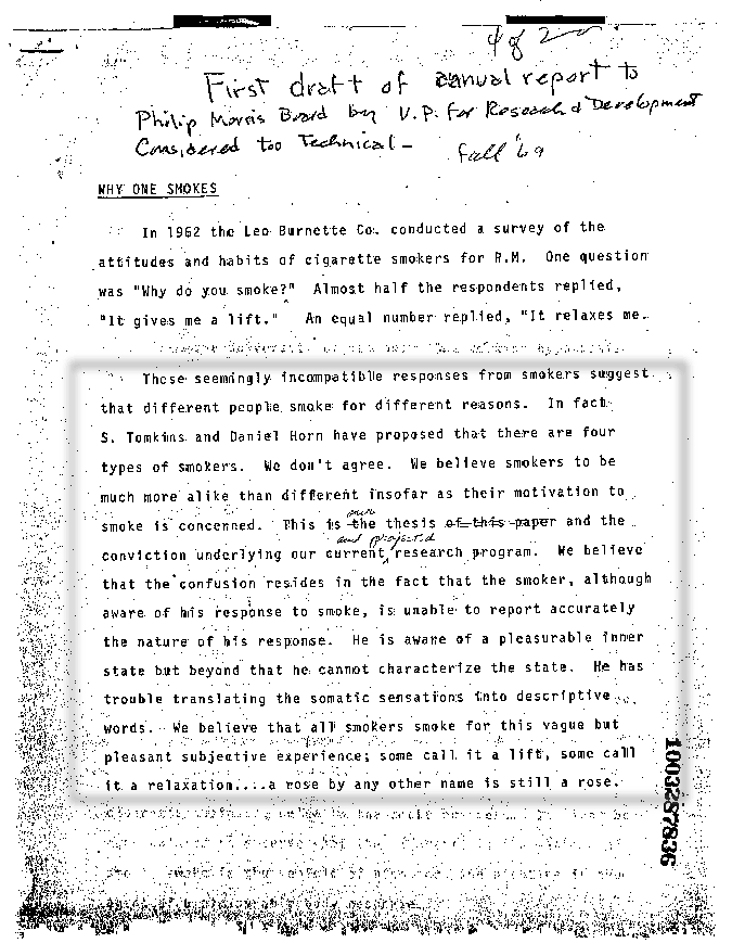This 1969 internal tobacco industry document from the Philip Morris archives provides unusual insight into the reasons why people smoke. This is a classic work that answers many questions asked frequently today -- over 30 years later. We highlight exerpts from the document and provide direct links to the actual pages. You can also visit the Philip Morris site and view the document on their site (see Source information below). Select pages from a second document [1, 2, 3], also from the Philip Morris archive, provides insight as to why girls begin smoking.