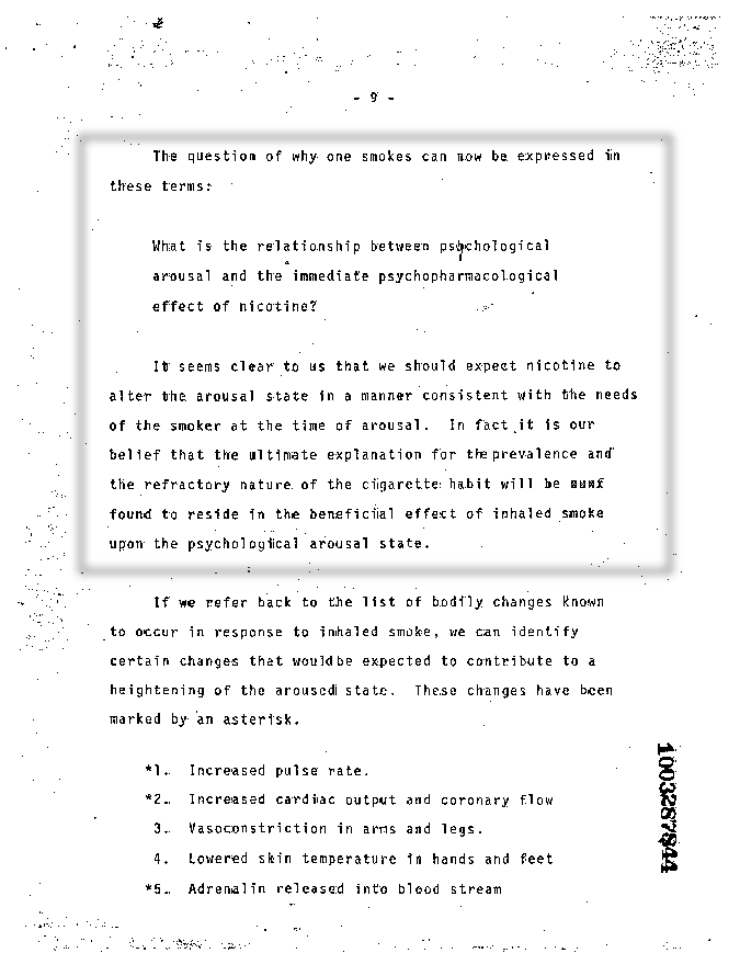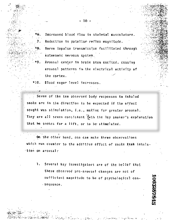 QUOTE: Seven of the ten observed body responses to inhaled smoke are in the direction to be expected if the effect sought was stimulation, i.e., making for greater arousal. They are all seven consistent with the lay smoker's explanation that he smokes for a lift, or to be stimulated [10].
