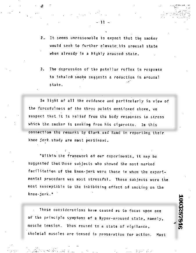 QUOTE: In light of all the evidence and particularly in view of the forcefulness of the three points mentioned above (see pages 10 and 11), we suspect that it is relief from the body response to stress which the smoker is seeking from his cigarette [11].
