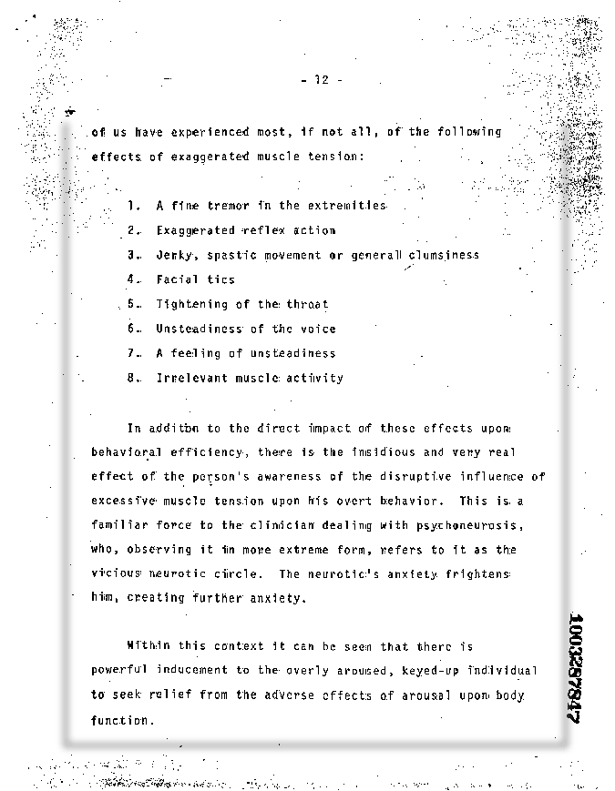 QUOTE: These considerations have caused us to focus upon one of the principle symptoms of a hyper-aroused state, namely, muscle tension. When roused to a state of vigilance, skeletal muscles are tensed in preparation for action. Most of us have experienced most, if not all, of the following effects of exaggerated muscle tension:
