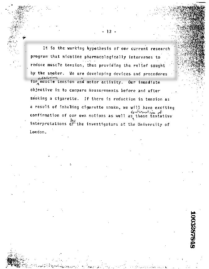 QUOTE: It is the working hypothesis of our current research program that nicotine pharmacologically intervenes to reduce muscle tension, thus providing relief sought by the smoker [13].