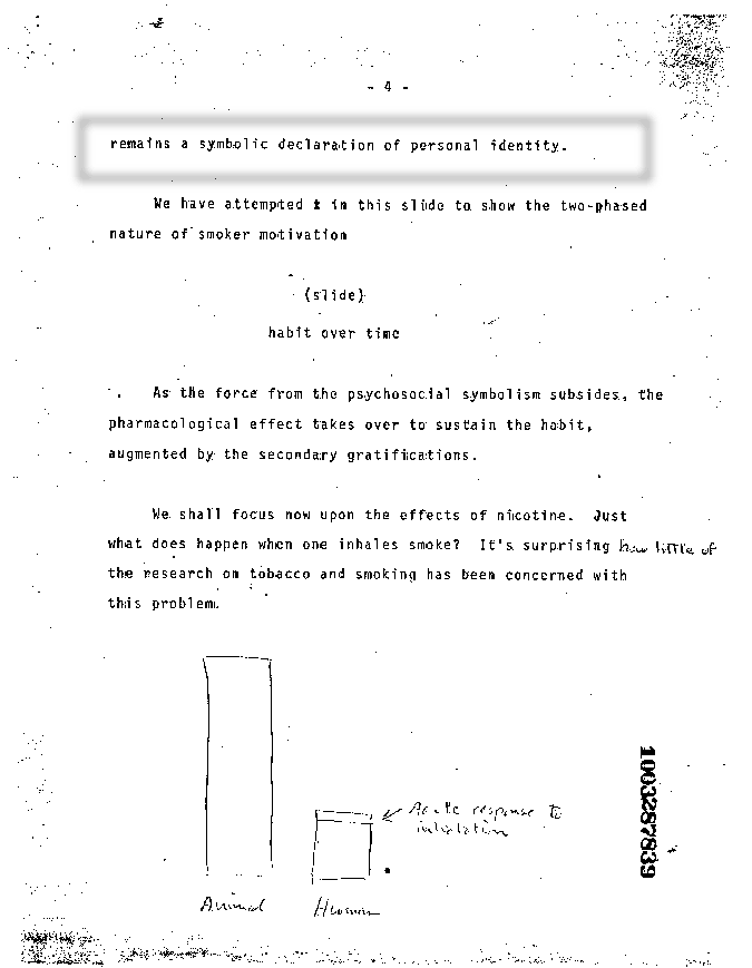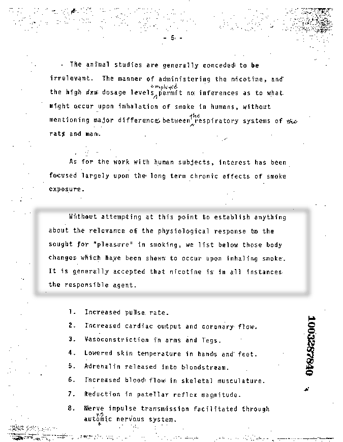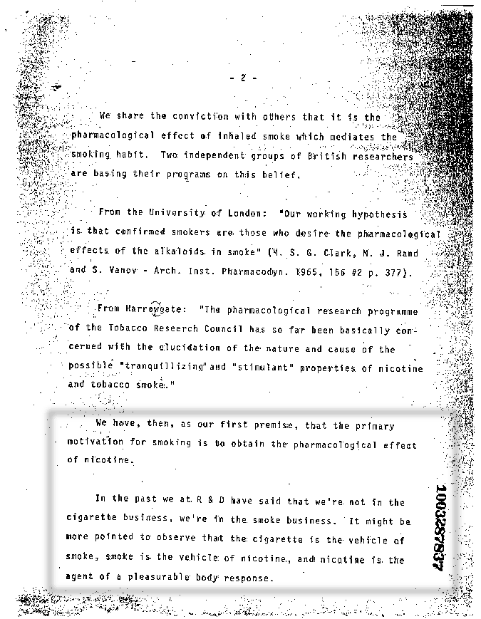 In the past we at R & D have said that we're not in the cigarette business, we're in the smoke business. It might be more pointed to observe that the cigarette is the vehicle of smoke, the smoke is the vehicle of nicotine, and nicotine is the agent of a pleasurable body response [2].