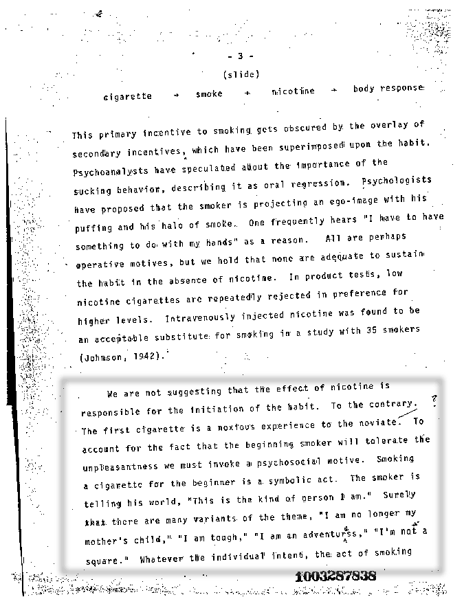 QUOTE: We are not suggesting that the effect of nicotine is responsible for the initiation of the habit. To the contrary. The first cigarette is a noxious experience to the noviate. To account for the fact that the beginning smoker will tolerate the unpleasantness we must invoke a psychosocial motive.