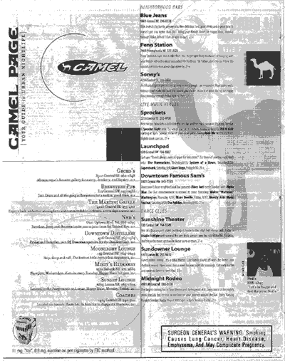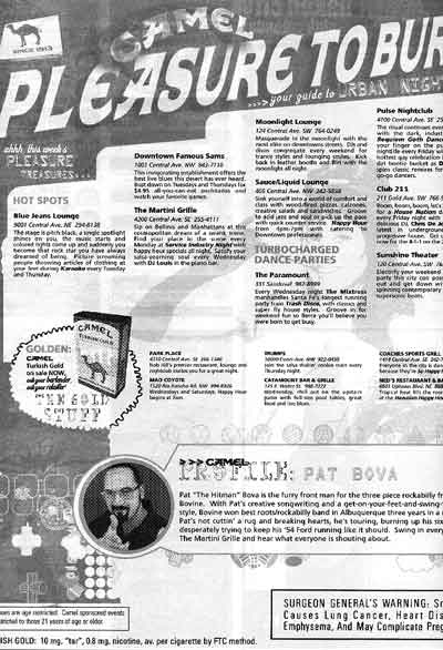 CAMEL CLUB EXPOSED Camel's logo is displayed a number of times. There is a smiling, happy woman in the lower left corner listed as "Some Gal." She is quoted saying, "Let's be happy and feel the joy at Ned's." Following the TIM strategy, the page highlights some of Albuquerque's perceived trendy spots. This includes Gecko's, Brewster's Pub and The Martini Grille. The page also features a number of Neighborhood Bars, various Live Music Venues and top Dance Clubs. The uncovered R.J. Reynolds' CONFIDENTIAL document shows the transparency of the TIM strategy. This document was a trial exhibit in the Mangini case (Mangini v. R.J. Reynolds Tobacco Company, Civil Case No. 939359). Is this strategy effective? Sales of Camel cigarettes skyrocketed through the mid-90s. Furthermore, Marlboro now has a similar strategy... |