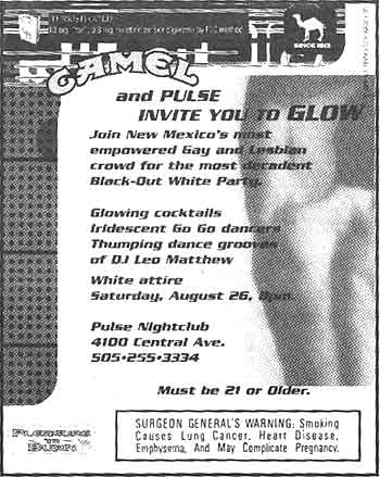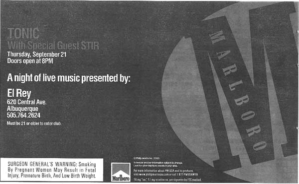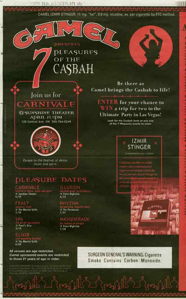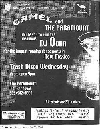 TobaccoFreedom.org uncovered a 1994 R.J. Reynolds tobacco company SECRET DOCUMENT describing the tobacco industry's strategy to use alternative publications to manipulate the preferences and behavior of American youth. The internal publication disclosed a new marketing approach referred to as Trend Influence Marketing (TIM). TIM abandons standard advertising campaigns and jumps directly into the arena of trying to "become the trend-maker." R.J. Reynolds and Philip Morris utilize TIM to increase the popularity of Camel and Marlboro cigarettes respectively. A report published in the January 2002 American Journal of Public Health concluded that, "The tobacco industry has increased its use of bars and clubs as promotional venues and has used the alternative press to reach the young adults who frequent these establishments. This increased targeting of young adults may be associated with an increase in smoking among this group" [summary of report]. The Journal article confirms the effectiveness of TIM, yet fails to speak directly to the deception associated with the tobacco industry strategy. This case study captures the historical development of Trend Influence Marketing in Albuquerque, New Mexico, beginning with the clandestine recruitment of smoking "hipsters" who surreptitiously peddle tobacco products to unsuspecting young adults, and tracks weekly tobacco industry penetration into the market using the "free" alternative publication, Weekly Alibi. HISTORICAL DEVELOPMENT OF TIM By the early 1990s tobacco industry executives were under intense pressure from anti-smoking advocacy groups. Education efforts had increased awareness among consumers about the illusions incorporated in traditional tobacco product advertising. Facing slowing sales of their tobacco products, the industry was looking for a new approach. TIM strategy acknowledges that "shoving products in the face of the consumer is no longer the successful way to infiltrate this market. Today's 'Generation X' consumer is most influenced by what he or she sees in the hands of friends, not by some stiff riding a horse in a magazine advertisement." The key element of TIM is to conduct the 'aggressive advertising' covertly. "The minute someone blatantly pushes 'trendy,' it's not. Trend Influence Marketing is underground. For this program to be executed properly, we as a marketing company will appear almost invisible. Nothing that takes place can appear sales-oriented and everything we do will be perceived as cool. The objective is to have 'hipsters' feel as though smoking Camel is their idea, that they started the trend." R.J. Reynolds stated further that to reach the hipsters we must "speak their language, dress their dress, and walk their walk." We will recruit "our field marketing staff from the 'inside.'" The original R.J. Reynolds' strategy is titled, "Camel Club." KBA Lifestyle Marketing developed the program. KBA states, "We will be recruiting our field marketing staff from the 'inside:' people who have worked in and around the nightclub/bar business and trendy community" [see SECRET DOCUMENT (p.3)]. In the May 6-12th and 13-19th, 1999 editions of the Weekly Alibi, KBA Lifestyle Marketing posted this employment ad. All TIM efforts will be reinforced by savvy, localized alternative media campaigns -- the Weekly Alibi is an example of a local alternative media publication. ROLE OF ALTERNATIVE PUBLICATIONS The promoters of Camel cigarettes noted "there are many local, national and international newspapers and magazines that hipsters read to follow the trends. These media vehicles are a critical part of the network to help the spread of trends... These free periodicals are distributed at most trendy nighclubs and are found in the stores and coffeehouses that the club crowd frequents... Aligning Camel with certain publications by way of advertising lends immediate hip credibility to the brand." Most U.S. cities have alternative publications. These tabloid-type newspapers are generally free to the public, widely distributed and published on a weekly basis. Publications like the Weekly Alibi are willing partners to this public deception. Frequently, the Weekly Alibi runs a self-promotion claiming their publication is, "The Best Paper Money Can't Buy." Weekly editions are free to the public, as revenue comes from the multitude of advertising. Money does buy influence between the covers. The Weekly Alibi is free and trendy. Many young people under age 18 read the weekly editions -- and there are numerous tobacco advertisements per issue. |